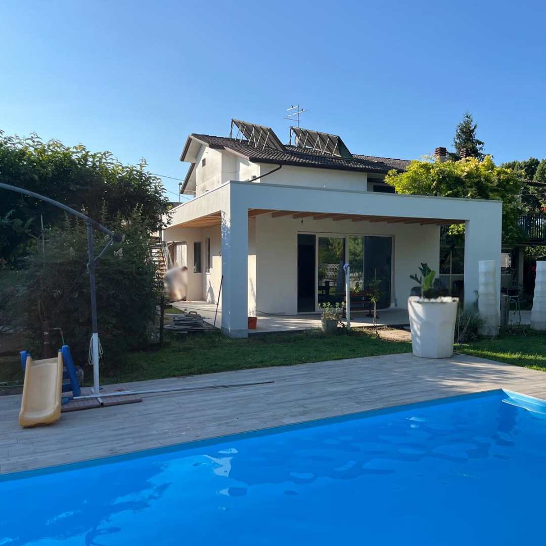 El elemento más destacado es su porche integrado, que incorpora vigas de madera vistas, aportando textura, calidez y continuidad estética entre el interior y el exterior. Un recurso arquitectónico que refuerza la integración con el entorno natural sin renunciar a un lenguaje contemporáneo.