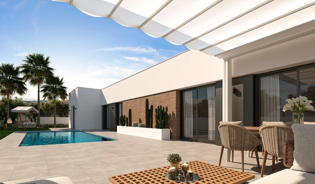 El diseño destaca por su estética moderna y la optimización de los espacios exteriores, que incluyen varias pérgolas estratégicamente ubicadas para proporcionar sombra y favorecer el uso del entorno en los días más soleados, ampliando así la superficie habitable hacia el exterior.