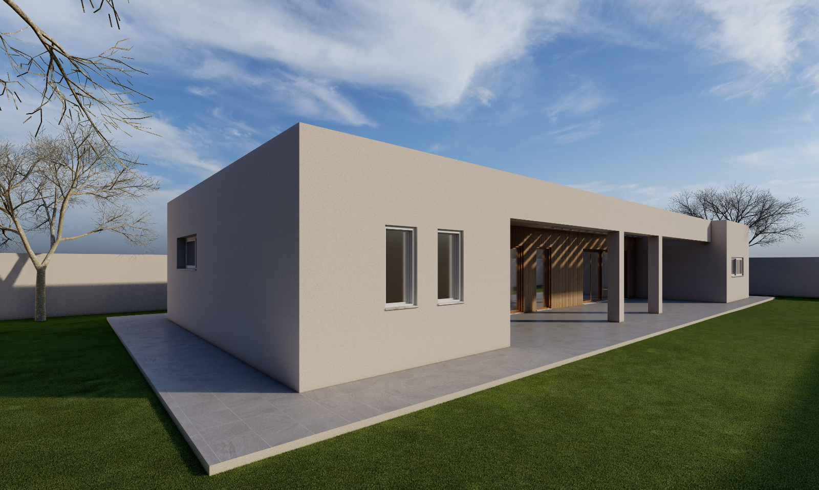 Proyecto de vivienda unifamiliar de 150 m² más porche, actualmente en fase de obtención de licencia de obras. La vivienda se organiza en una sola planta, apostando por la funcionalidad y la accesibilidad total.